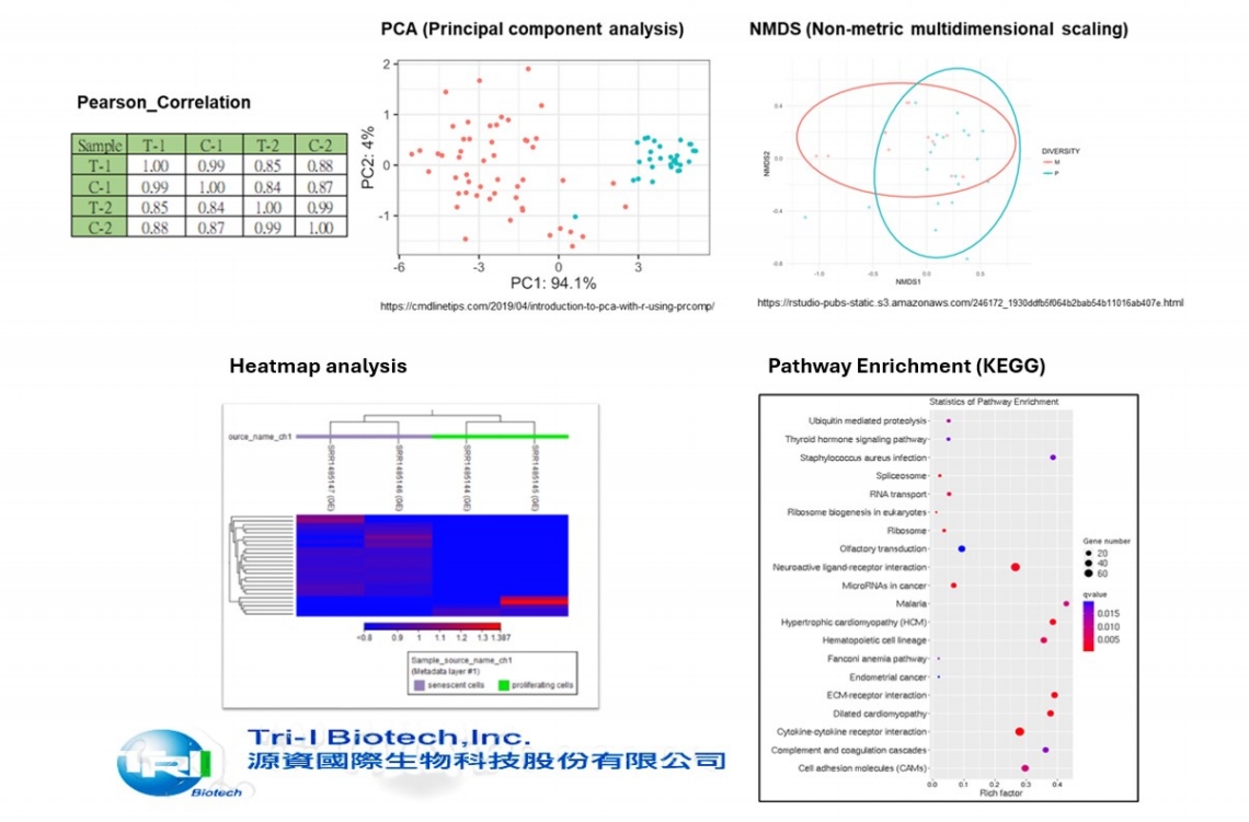 Correlation Analysis : 評估樣本之間整體基因表現相似度。利用所有基因的表現量,計算兩兩樣本之間的 Pearson 係數,並以相關矩陣 PCA (Principal Component Analysis) 及 NMDS (Non-metric multidimensional scaling) 圖呈現。此分析的意義在於確認相同處理樣本之間是否彼此相似,以及不同條件是否呈現預期的差異。如果同組樣本的相關性高,代表樣本間差異主要來自實驗處理;若同組樣本相關性低,可能表示樣本品質不一致、處理不穩定或有混入汙染樣本。相關性分析是 RNA-Seq 中檢查資料可靠度與確定樣本間生物差異的重要步驟,直接影響後續差異表現基因分析的可信度。