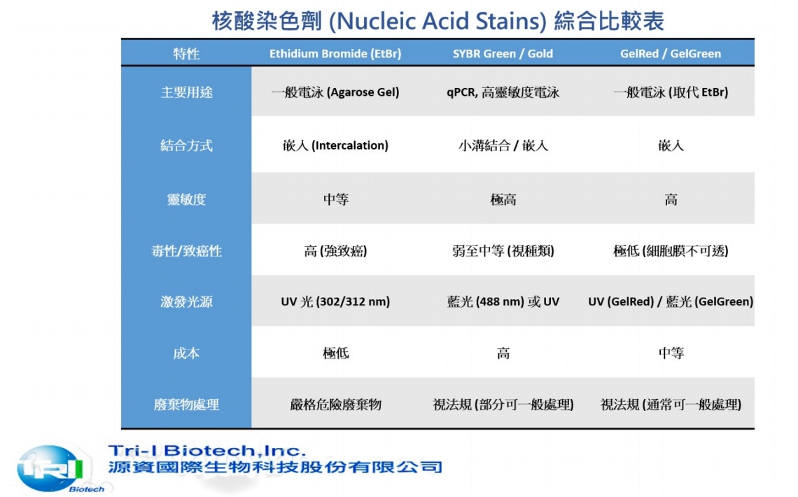 地位: 高靈敏度的替代品,常用於 qPCR (即時聚合酶連鎖反應) 或高階電泳。